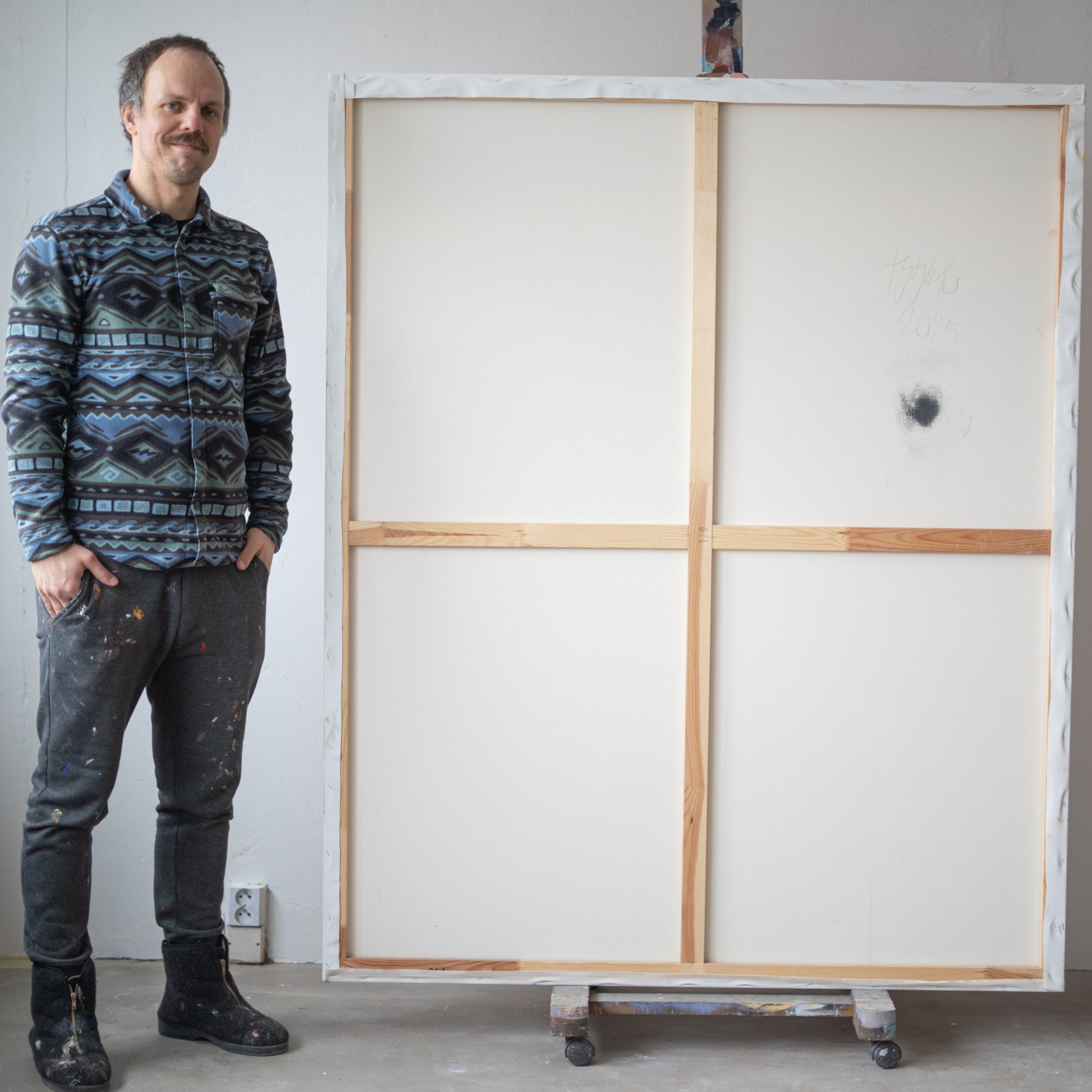Výrazný český malíř zde představuje obraz založený na graficky strukturované kompozici a důsledné práci s linií. Kombinace kresby, spreje a šablony vytváří napětí mezi jasně vymezenými tvary a měkčími, volně se rozpíjejícími plochami. Celek působí jako vizuální průchod krajinou na pomezí reality a vnitřních světů.