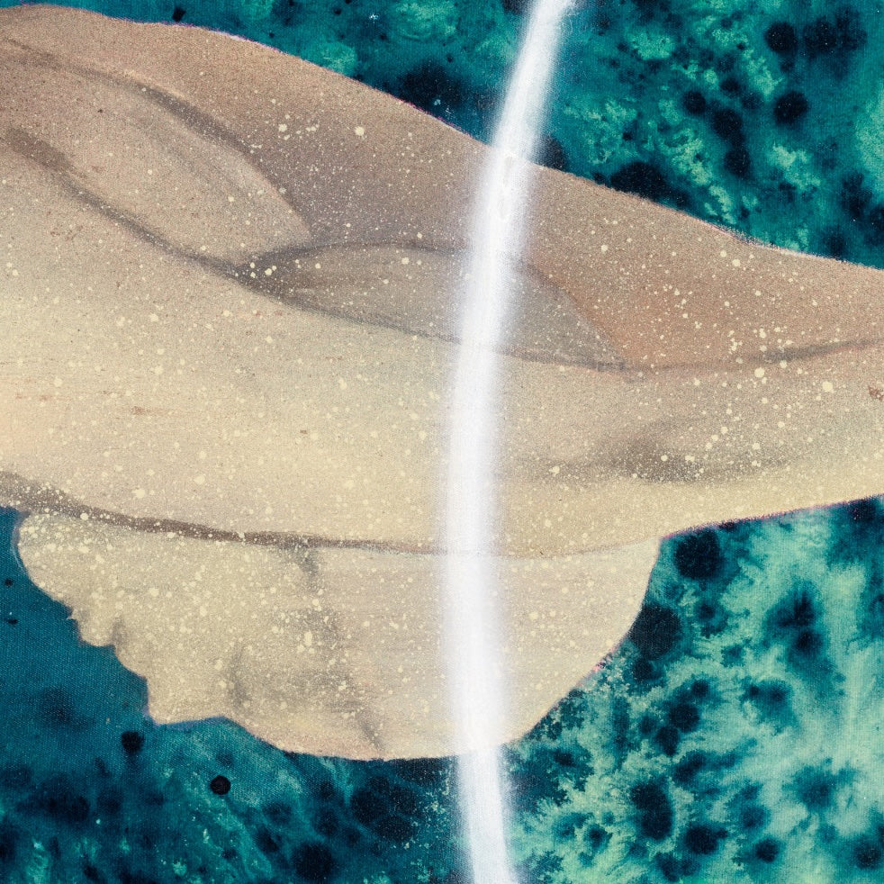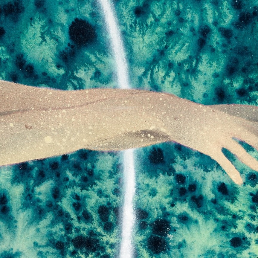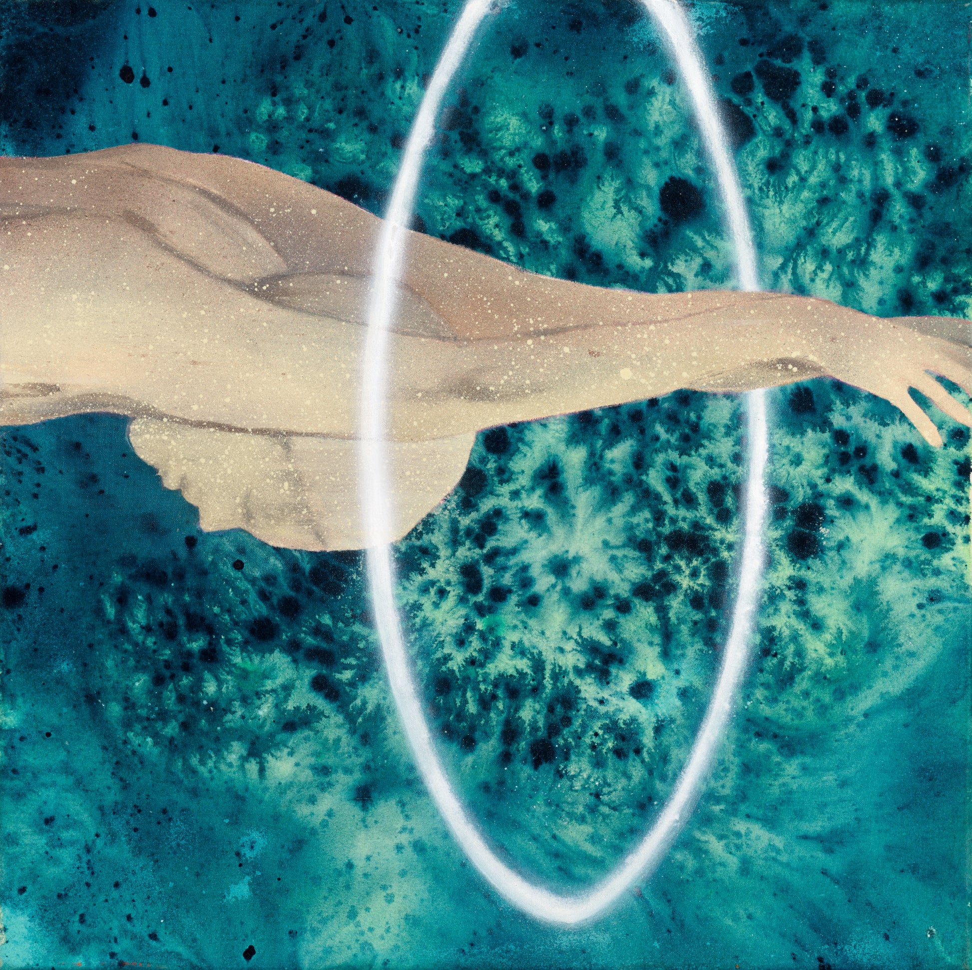 Prieplav“ navazuje na dlouhodobý motiv Kristíny Mésároš, v němž lidská figura vstupuje do nejednoznačných, tekutých prostředí připomínajících vodu či jiné přechodové prostory. Charakteristická světelná linie zde funguje jako klíčový prvek - podobně jako v jiných jejích cyklech vymezuje hranici, kterou postava překračuje. Dílo tak rozvíjí autorčinu práci s tématem průchodu, zanoření a proměny, tentokrát s důrazem na konfrontaci těla a dynamické, organické struktury podkladu.
