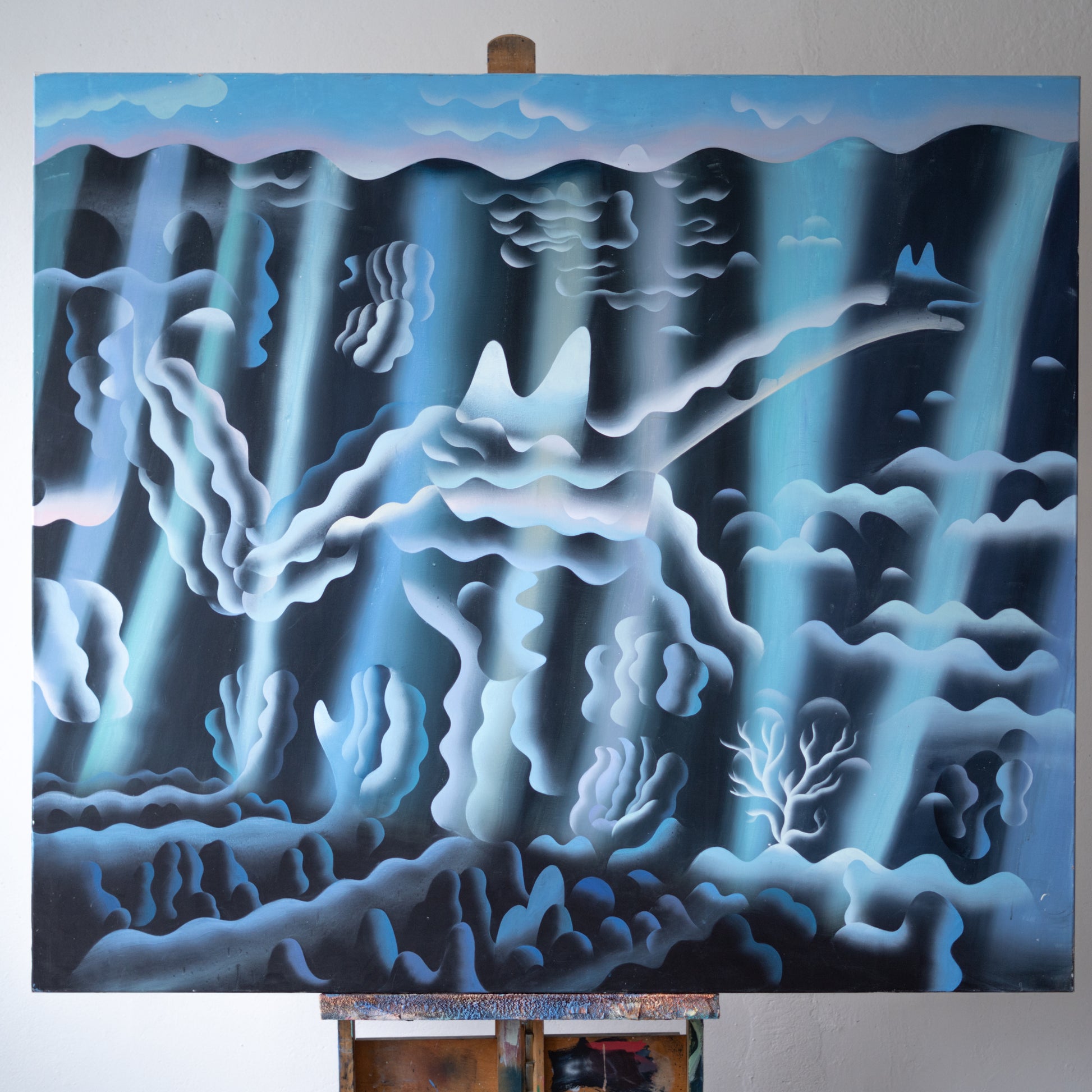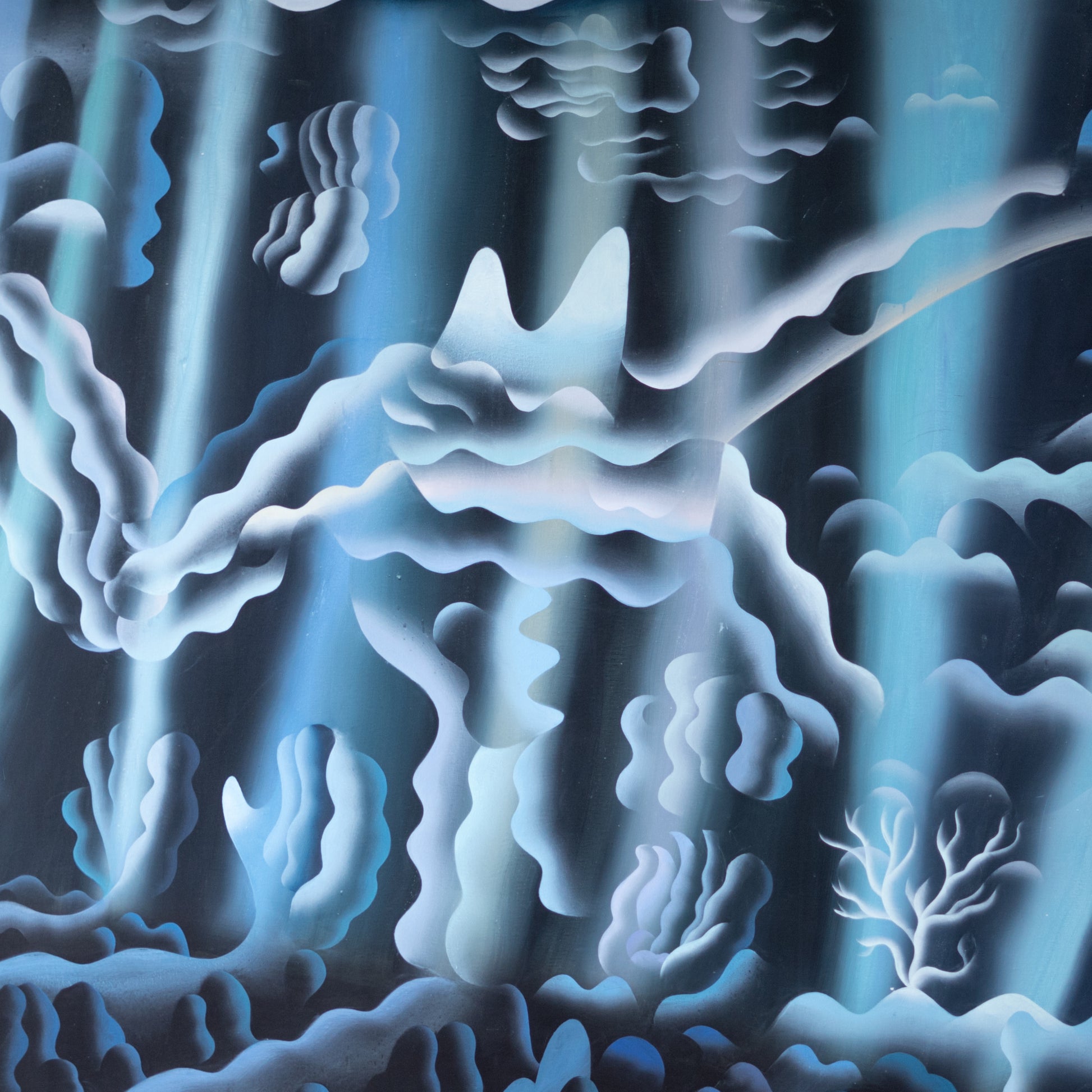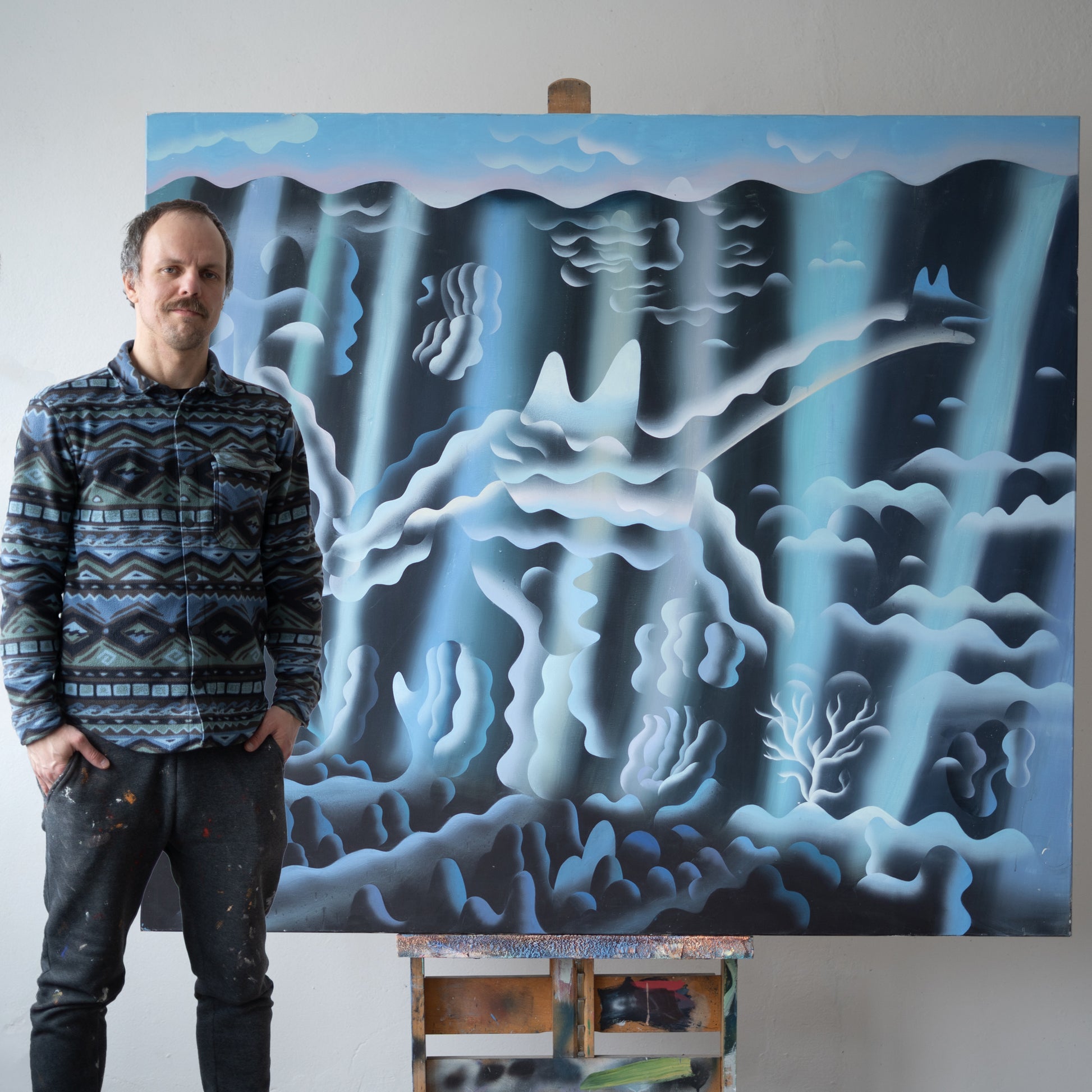 Obraz výrazného českého malíře je vystavěn na graficky strukturované kompozici a soustředěné práci s linií. Prolínání kresby, spreje a šablony vytváří napětí mezi přesně definovanými tvary a měkčími, volně se rozpíjejícími plochami. Výsledná scéna působí jako vizuální putování krajinou na hraně reality a vnitřních světů, v níž se vynořují archetypální obrazy hluboko uložené pod hladinou osobní paměti.