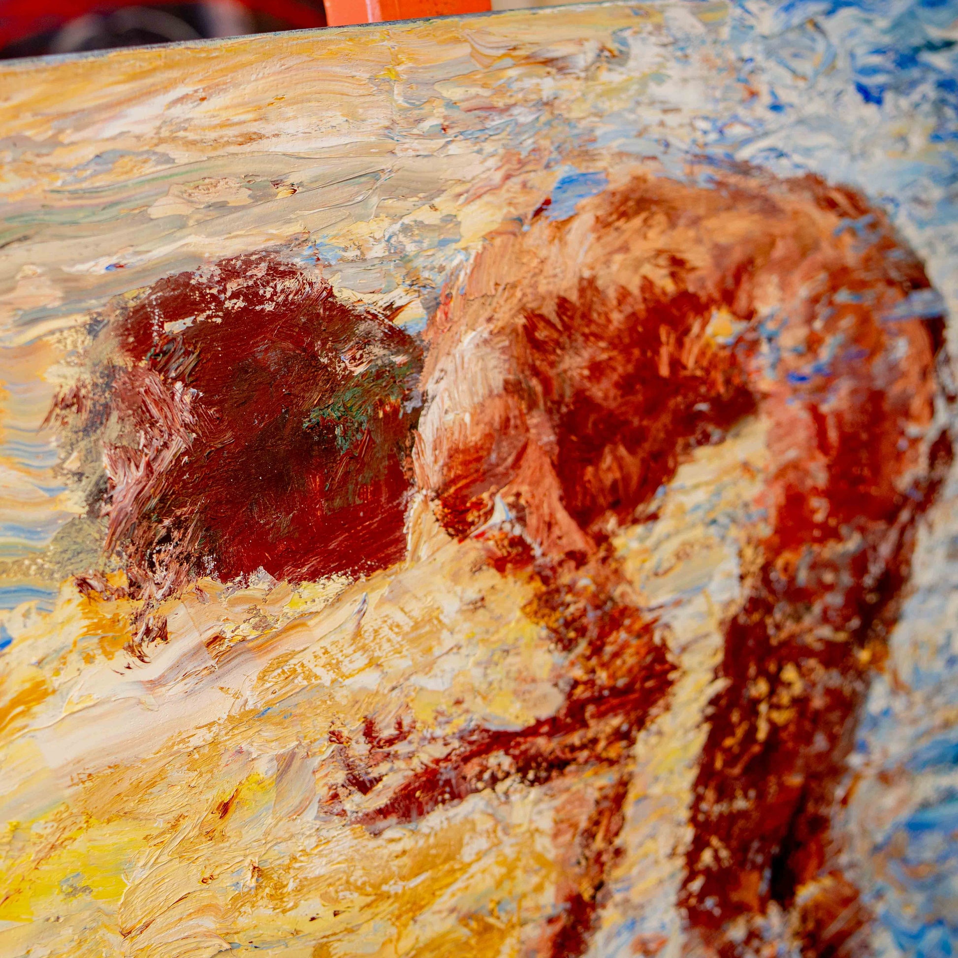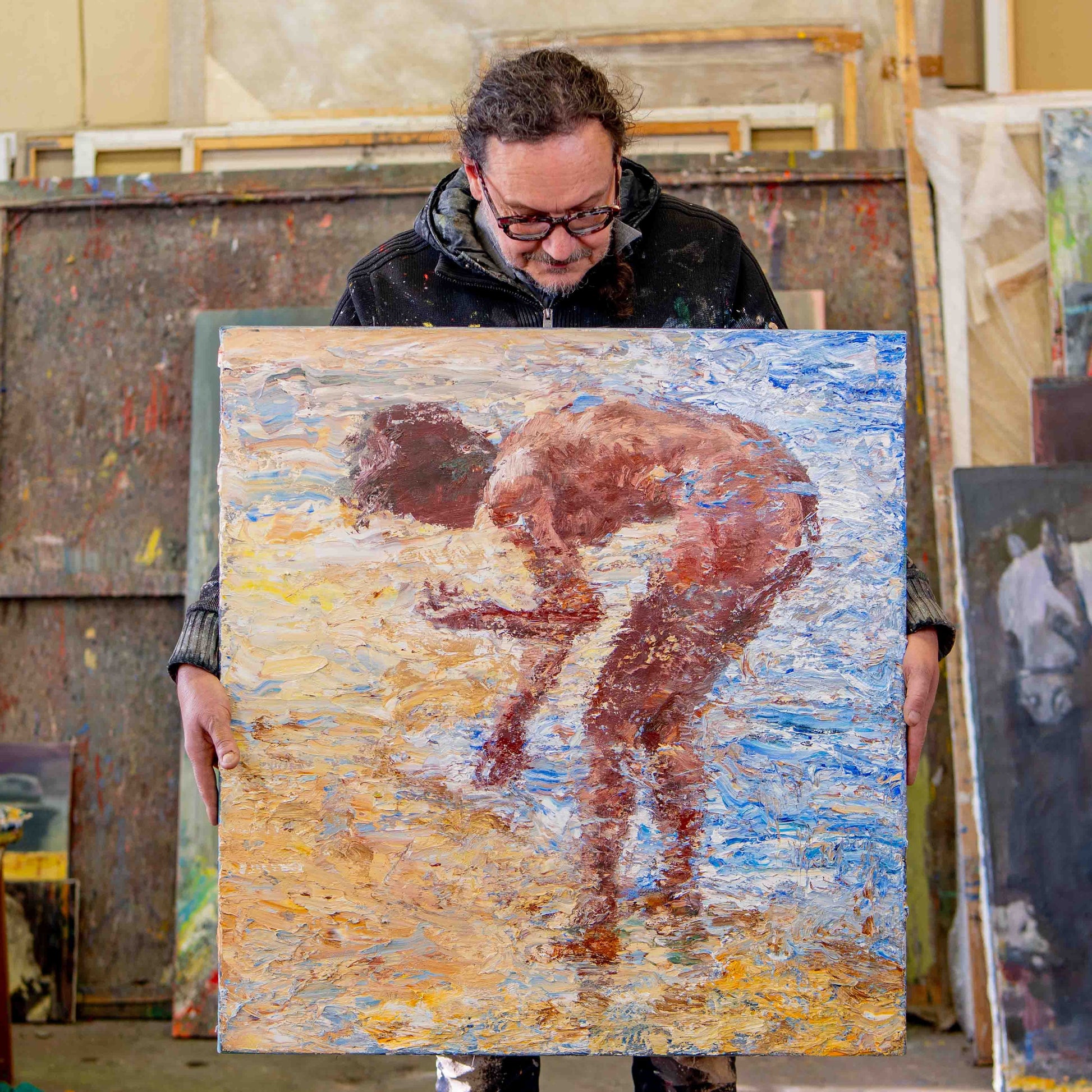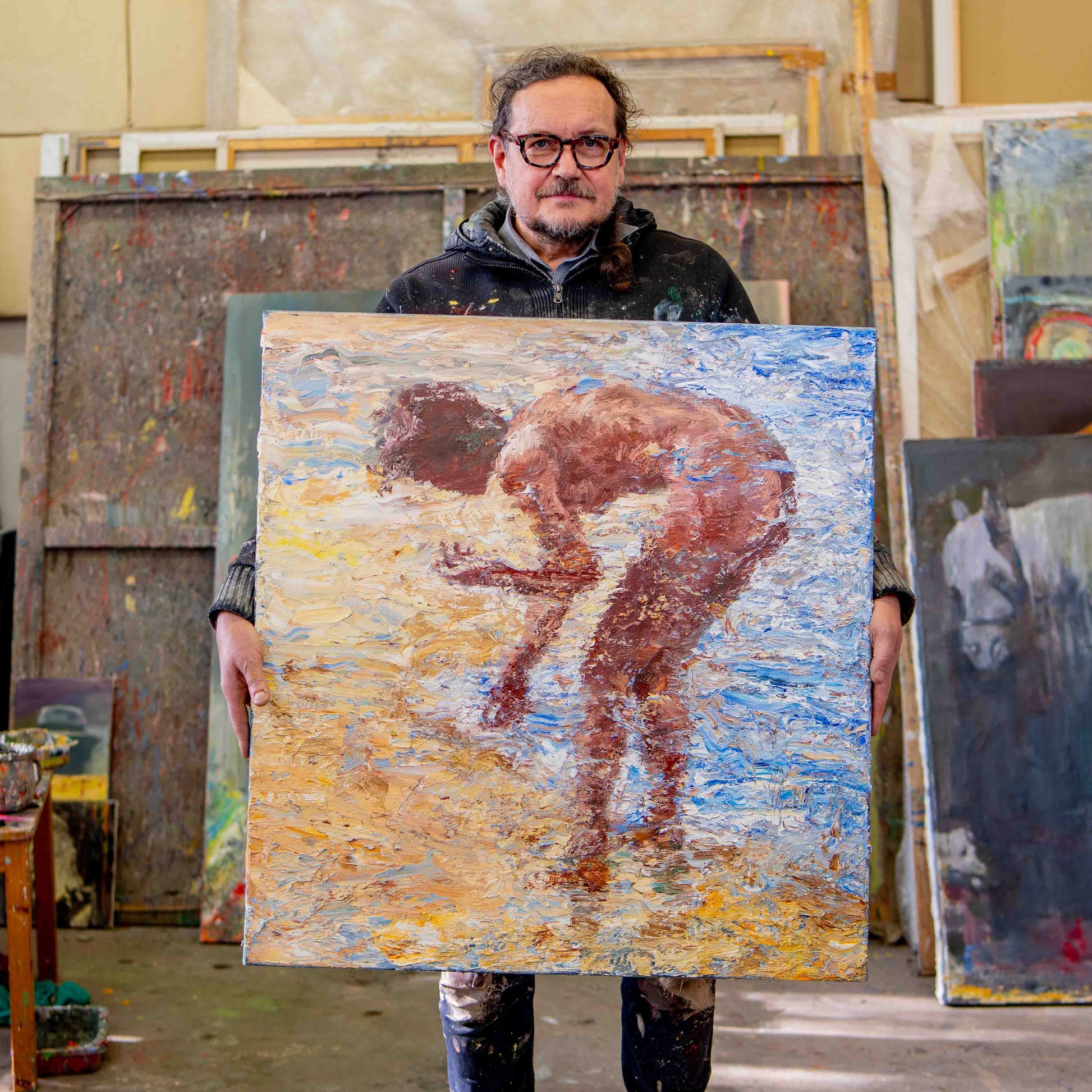 Pavel Šmíd je výrazný český malíř známý osobitou figurální malbou plnou energie a upřímnosti. Akt na pláži zachycuje obyčejný letní moment s malířskou hutností a lidskou bezprostředností, která je pro jeho tvorbu typická.